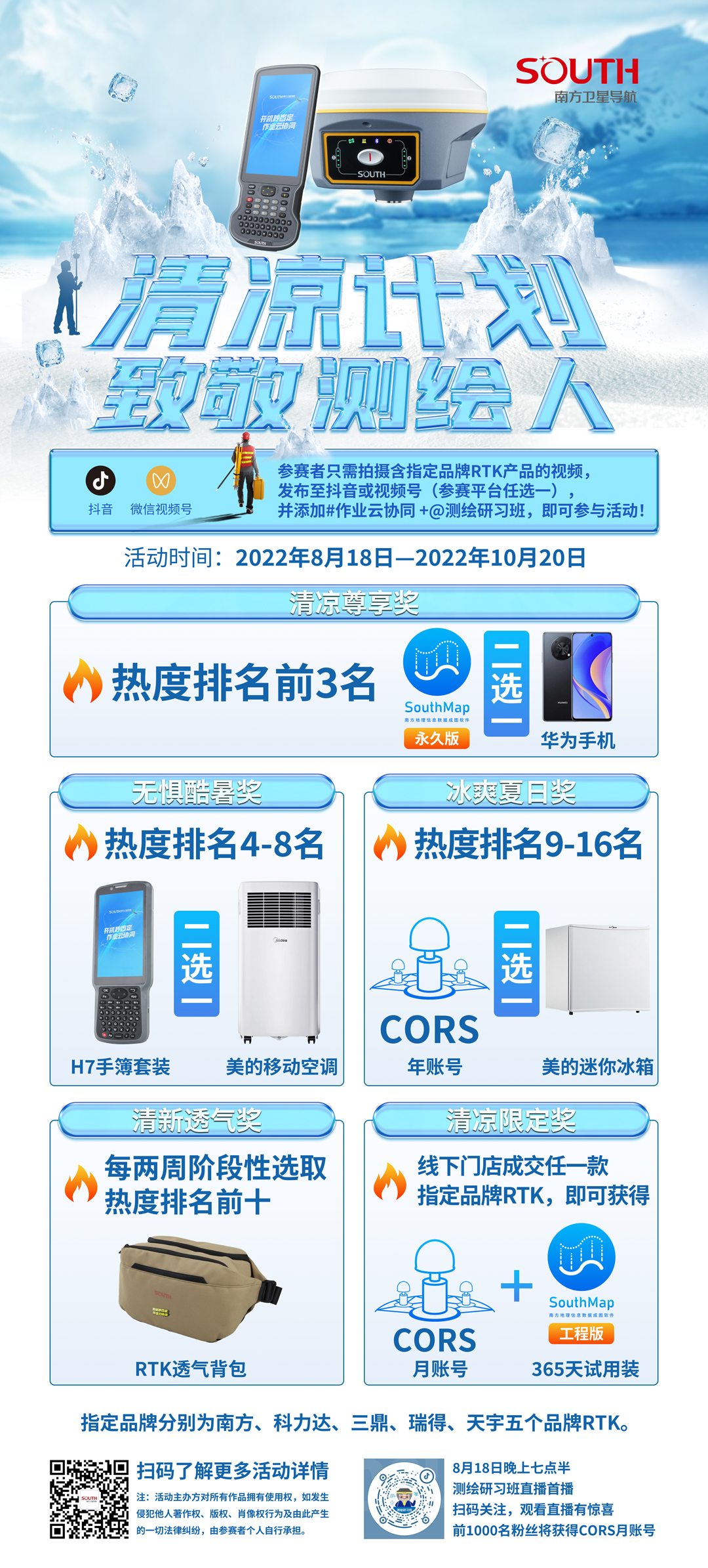 參賽者只需拍攝指定品牌產(chǎn)品的視頻,發(fā)布至抖音或視頻號(參賽平臺任選一),并添加 #作業(yè)云協(xié)同  +@測繪研習(xí)班,即可參與活動!1.本次活動熱度將根據(jù)視頻點贊數(shù)數(shù)量評估,熱度排名由抖音和微信視頻號兩大平臺參賽視頻匯總排名,清涼尊享獎、無懼酷暑獎、冰爽夏日獎三個獎項為活動總熱度排名,清新透氣獎為每兩周階段性熱度排名;2.所有獎項除清新透氣獎外,同一參賽者只可獲得單項獎,如參賽者投稿多個視頻,只以點贊數(shù)最高的單條視頻為準(同一注冊賬號/電話/地址/郵箱等均視為同一參賽者);3.參賽者拍攝作品需為原創(chuàng),出鏡產(chǎn)品為南方、科力達、三鼎、瑞得、天宇五個指定品牌,視頻時長不限,展現(xiàn)測繪日常、測繪場景、測繪人樂觀向上的精神面貌等;4.每兩周在廣州南方衛(wèi)星導(dǎo)航公眾號推文及測繪研習(xí)班抖音直播間公布清新透氣獎,參賽者請密切關(guān)注,獲獎的參賽者可通過添加客服微信(SOUTHKEFU)領(lǐng)取獎品;5.活動嚴禁“刷贊”等弄虛作假行為,一經(jīng)發(fā)現(xiàn)查實,將取消活動參與資格;6.8月18日前,帶#南方云協(xié)同+@測繪研習(xí)班的參賽作品可參與活動熱度排名,自8月19號起,參賽以添加#作業(yè)云協(xié)同+@測繪研習(xí)班為準,否則視為無效作品;7.活動主辦方對所有作品擁有使用權(quán),如發(fā)生侵犯他人著作權(quán)、版權(quán)、肖像權(quán)行為及由此產(chǎn)生的一切法律糾紛,由參賽者個人自行承擔(dān)。